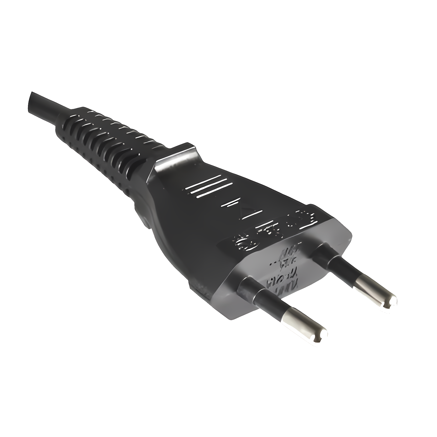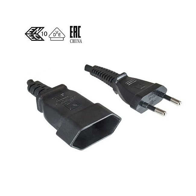 - kleiner flacher Euro-Stecker (CEE 7/16, Typ C / in Schweiz Typ 26) auf entsprechende Euro-Buchse