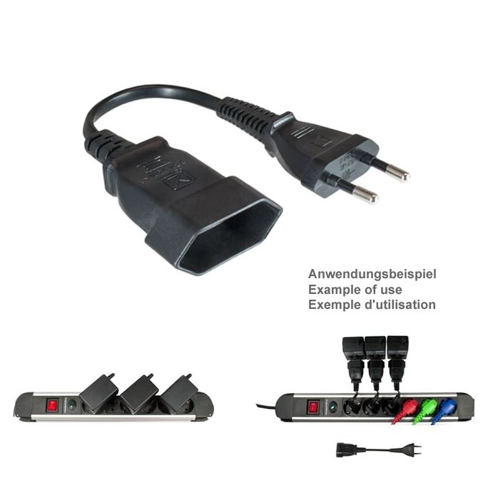 Das Kabel ist auf der Strom-Netzseite mit einen sog. Eurostecker (CEE 7/16, Typ C / in Schweiz Typ 26) ausgestattet. Dieser flache Steckertyp kann mit Ausnahme von UK, Irland, Malta und Zypern in ganz Europa eingesetzt werden, daher "Euro". An der anderen Seite hat das Kabel die entsprechende Euro-Buchse in die Sie z.B. ein Steckernetzteil einstecken können.