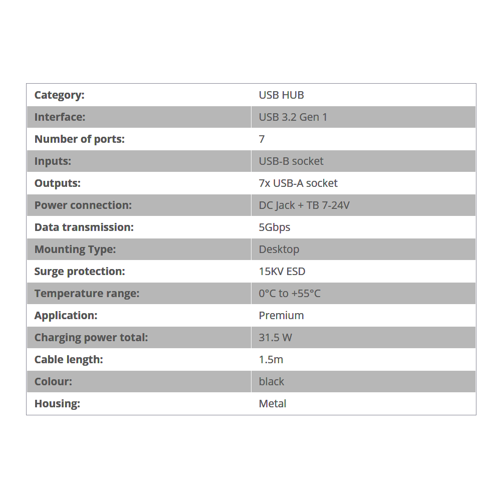 7 Port USB 3.2 Gen 1 Metall HUB mit 1.5A Ladestrom für Smartphones und Tablets