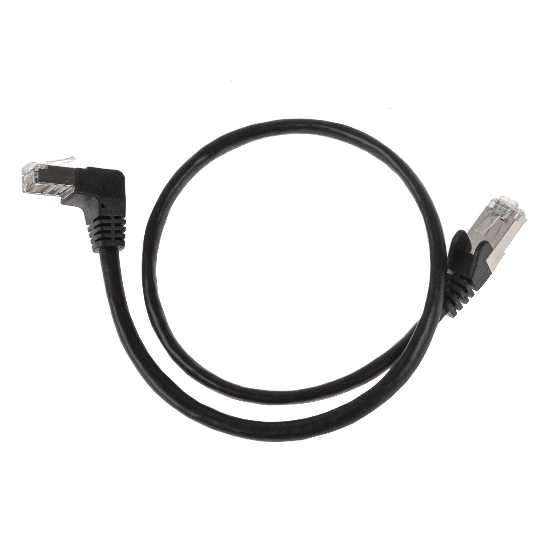 Netzwerkkabel Cat.6A, 1x RJ45 Stecker NACH UNTEN 90° abgewinkelt, 1x Stecker RJ45 gerade, AWG26 (CU), S/FTP (PIMF), schwarz, 0.5m
