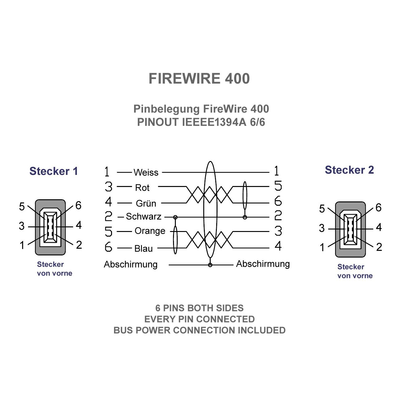 Das IEEE1394a-konforme Firewire 400 Kabel ist doppelt abgeschirmt (Folien- und Geflechtschirm) und hat paarig verdrillte Datenleitungen. Die Stecker sind intern komplett metallgekapselt. Alle drei IEEE-1394a-Geschwindigkeiten werden unterstützt: S400 mit 400 MBit/s (Firewire 400), S200 (200 MBit/s) und S100 (100 MBit/s).