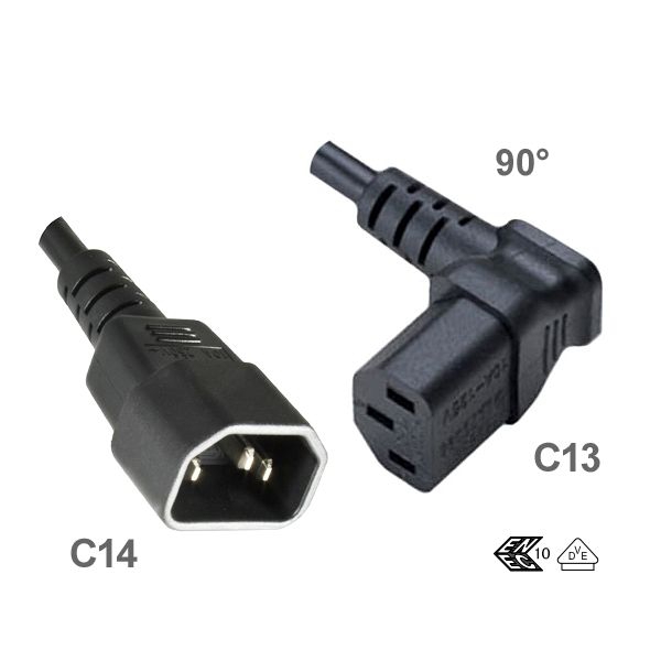 Kaltgeräteverbinder vom Typ IEC-60320 C13 werden für den Stromanschluss von Geräten verwendet, die im Betrieb keine oder kaum Wärme entwickeln. Dies sind z.B. PCs. Durch die 90° Winkelung sparen Sie Platz. Die maximale Temperatur des Steckers darf 70 °C nicht überschreiten und der maximale Stromdurchfluss ist auf 10 A festgelegt.