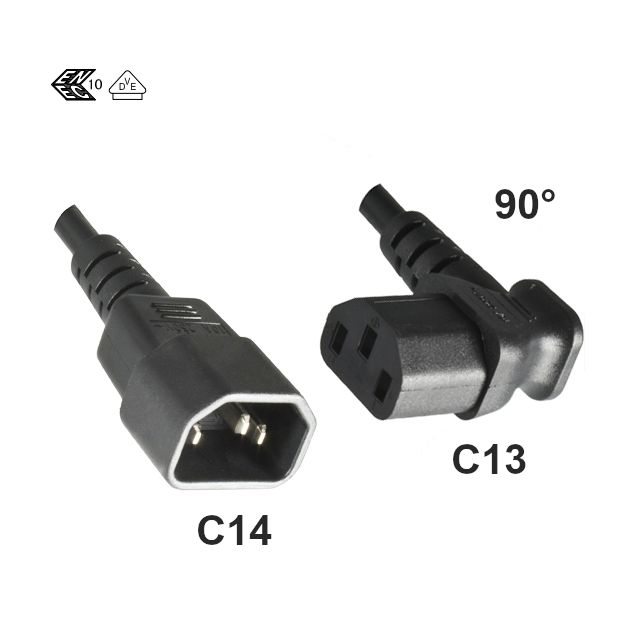 Kaltgeräteverbinder vom Typ IEC-60320 C13 werden für den Stromanschluss von Geräten verwendet, die im Betrieb keine oder kaum Wärme entwickeln. Dies sind z.B. PCs. Durch die 90° Winkelung sparen Sie Platz. Die maximale Temperatur des Steckers darf 70 °C nicht überschreiten und der maximale Stromdurchfluss ist auf 10 A festgelegt.
