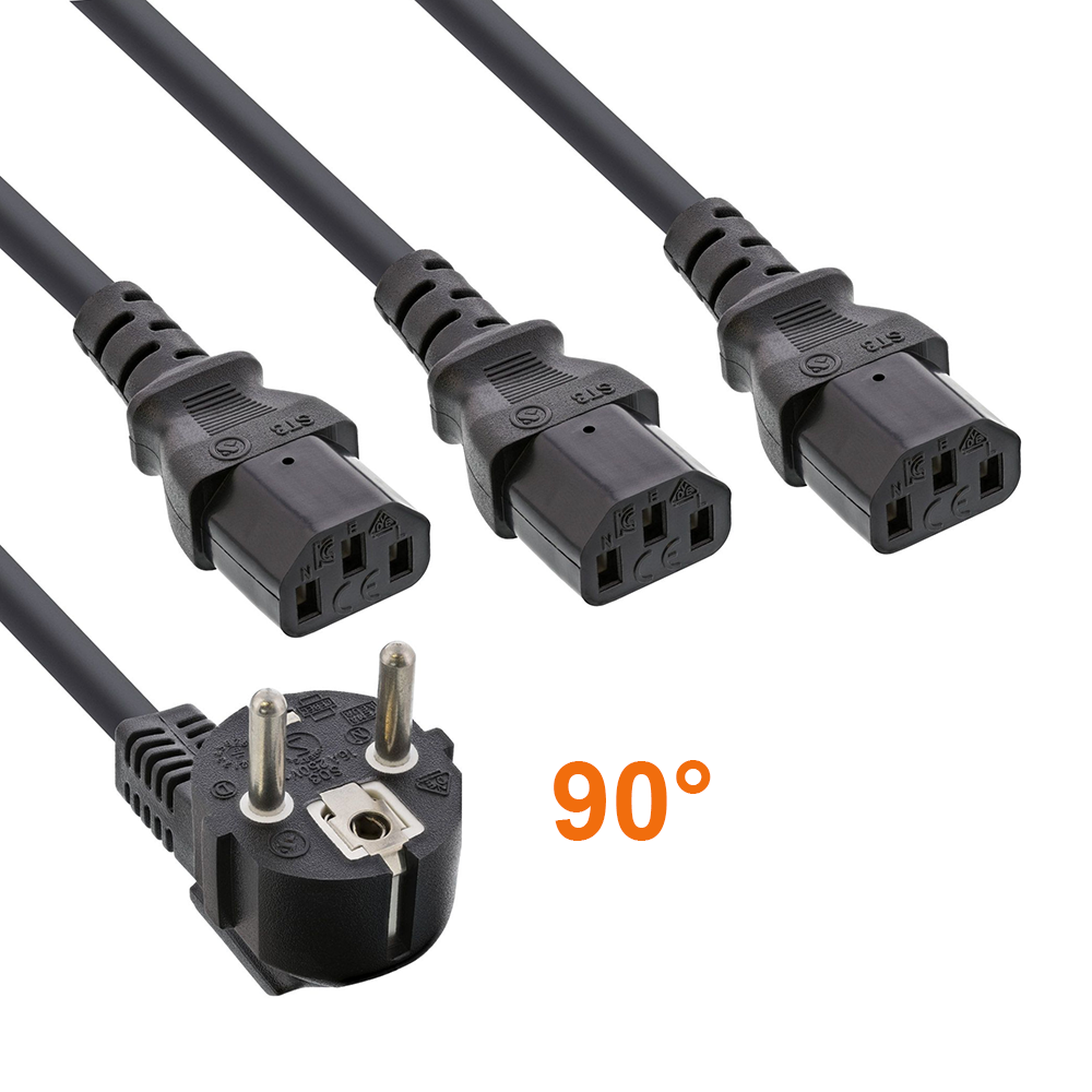 Kaltgeräte-Verzweigungskabel für 3 Geräte, 1x Schutzkontakt-Stecker CEE 7/7 E+F (90° abgewinkelt) an 3x Kaltgerätestecker C13, Gesamtlänge 1.8m (60cm + 3x 120cm)