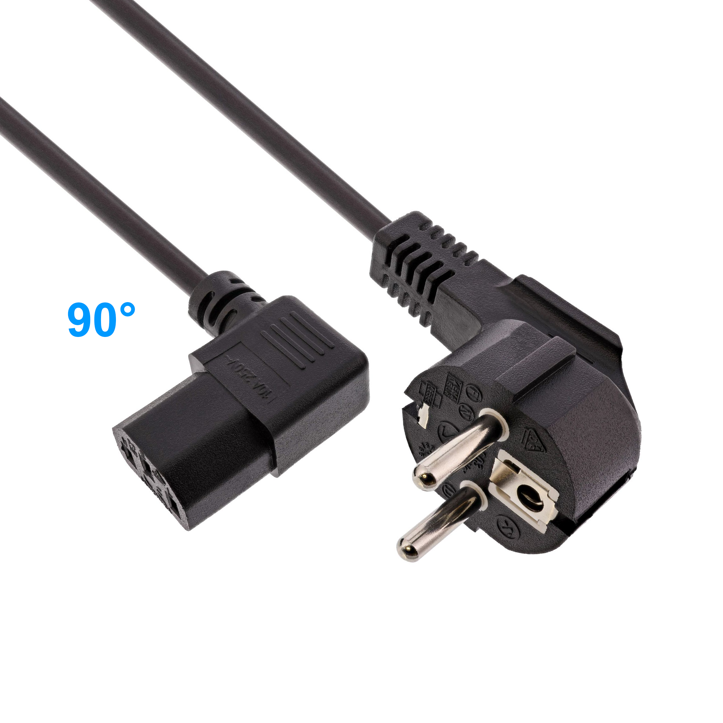 Beidseitig abgewinkeltes Kaltgerätekabel für Kontinental-Europa (Deutschland, Frankreich u.a.), 1m, 3G x 0,75mm², Schutzkontakt-Stecker CEE 7/7 E+F (90°) an Kaltgeräte-Stecker C13 (90° gewinkelt NACH RECHTS)