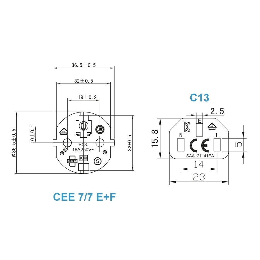 Der gewinkelte Netzstecker ist ausgeführt als Kombistecker-Typ E+F gemäß CEE-7/7-System. Durch das CEE-7/7-System (eine Steckerart mit einem ergänzenden Loch für den französischen Erdungszapfen) wird die Verwendbarkeit des Kabels auch in französisch geprägten Gebieten sichergestellt (Belgien, Marokko, Monaco, Polen, Slowakei, Tschechien, Tunesien, Frankreich und ein Teil der ehemaligen Kolonien).