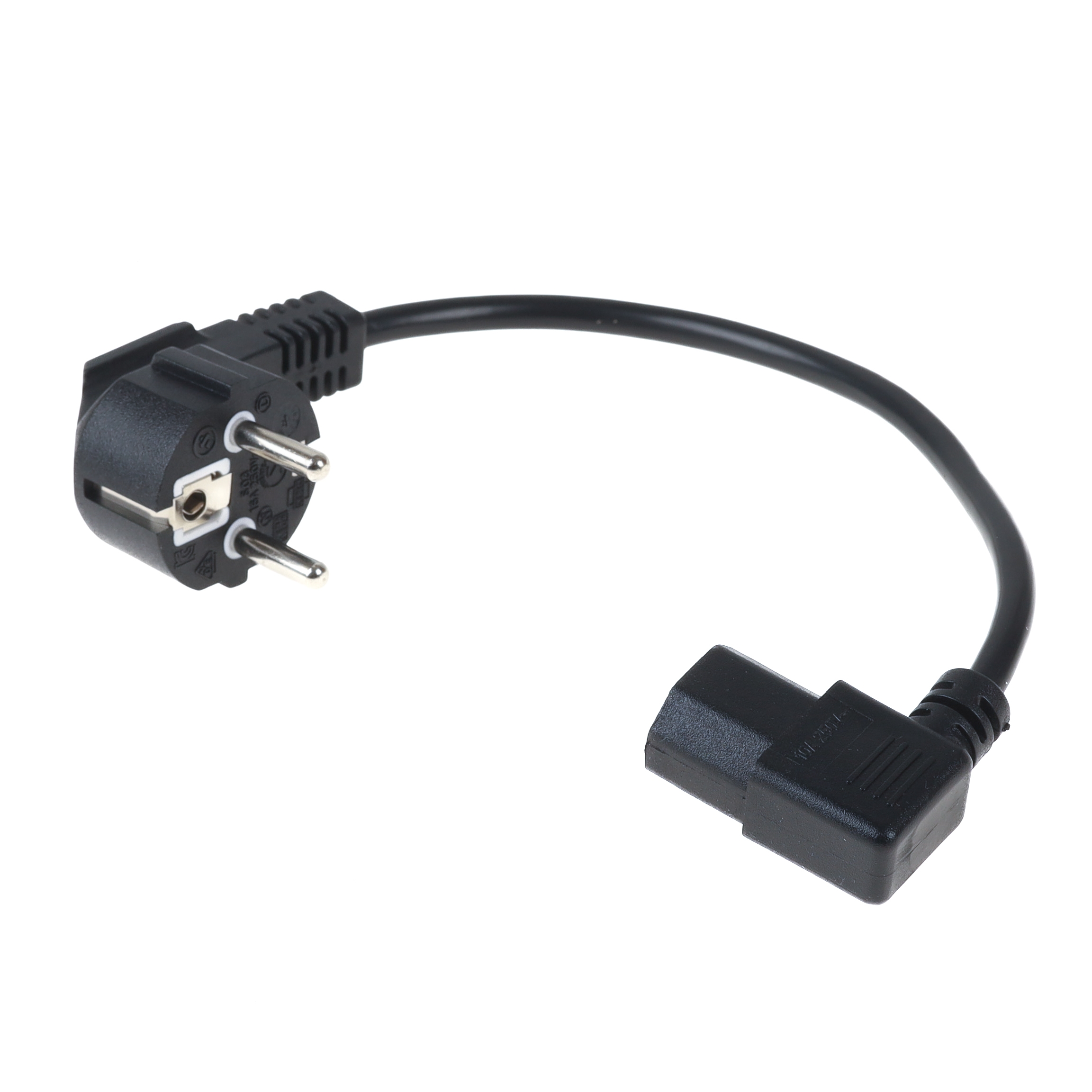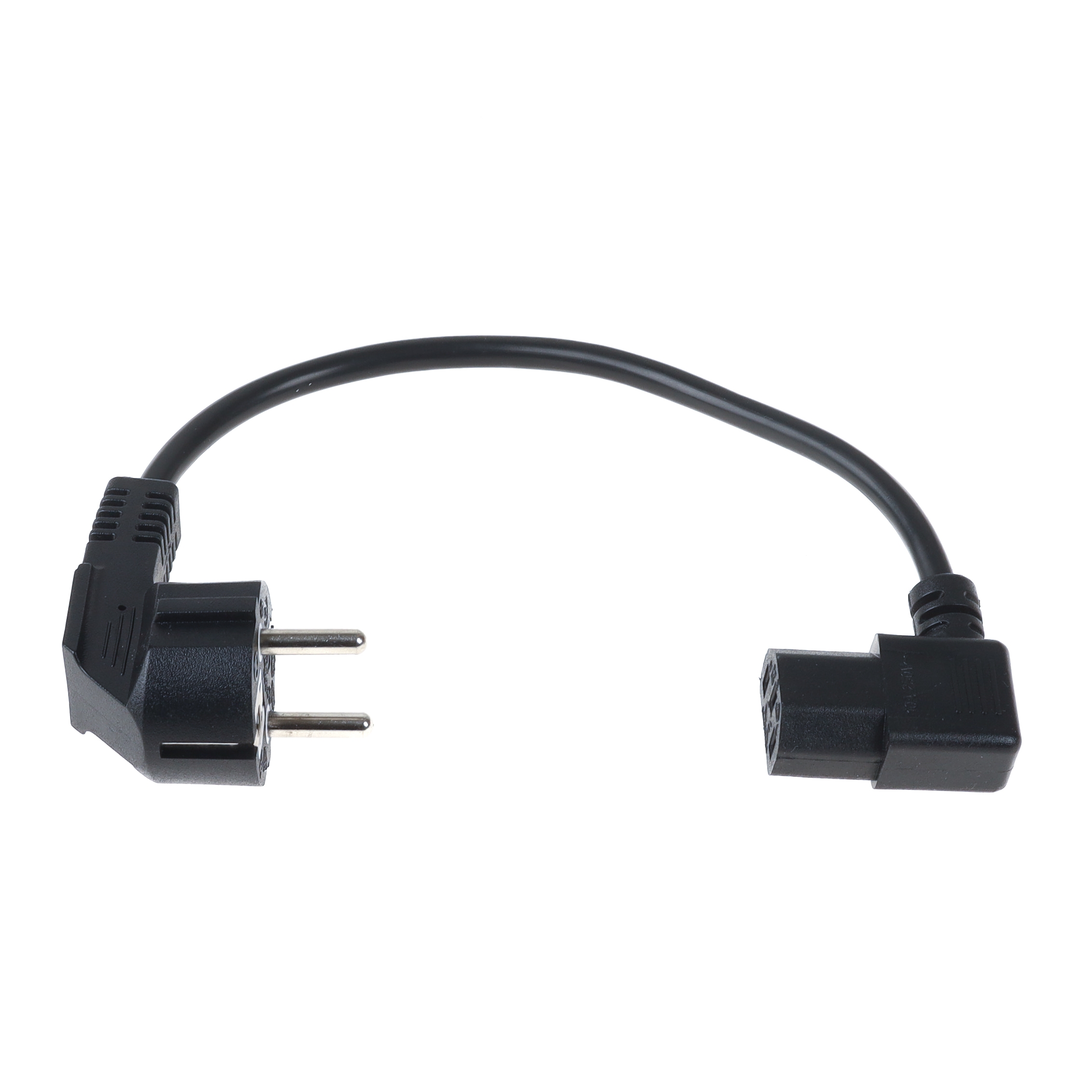 Beidseitig abgewinkeltes Kaltgerätekabel für Kontinental-Europa (Deutschland, Frankreich u.a.), 30cm, 3G x 0,75mm², Schutzkontakt-Stecker CEE 7/7 E+F (90°) an Kaltgeräte-Stecker C13 (90° gewinkelt NACH RECHTS)