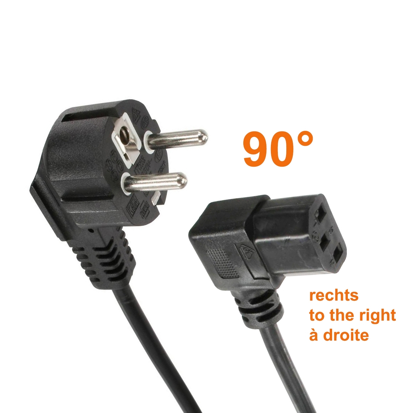 Wir bezeichnen den C13 Kaltgerätestecker als 90° NACH RECHTS gewinkelt. Bitte prüfen Sie die Ausrichtung des Kaltgeräteanschlusses Ihres Gerätes. Möglicherweise ist das, was wir als 'nach rechts' bezeichen, bei Ihnen 90° nach oben, unten oder links. Sie müssen die abgeschrägten Ecken des Steckers beachten. Wenn man in Einsteckrichtung von hinten auf den Stecker schaut und beide abgeschrägte Ecken des C13-Kaltgerätesteckers oben sind, geht das Kabel 90° NACH RECHTS weg.