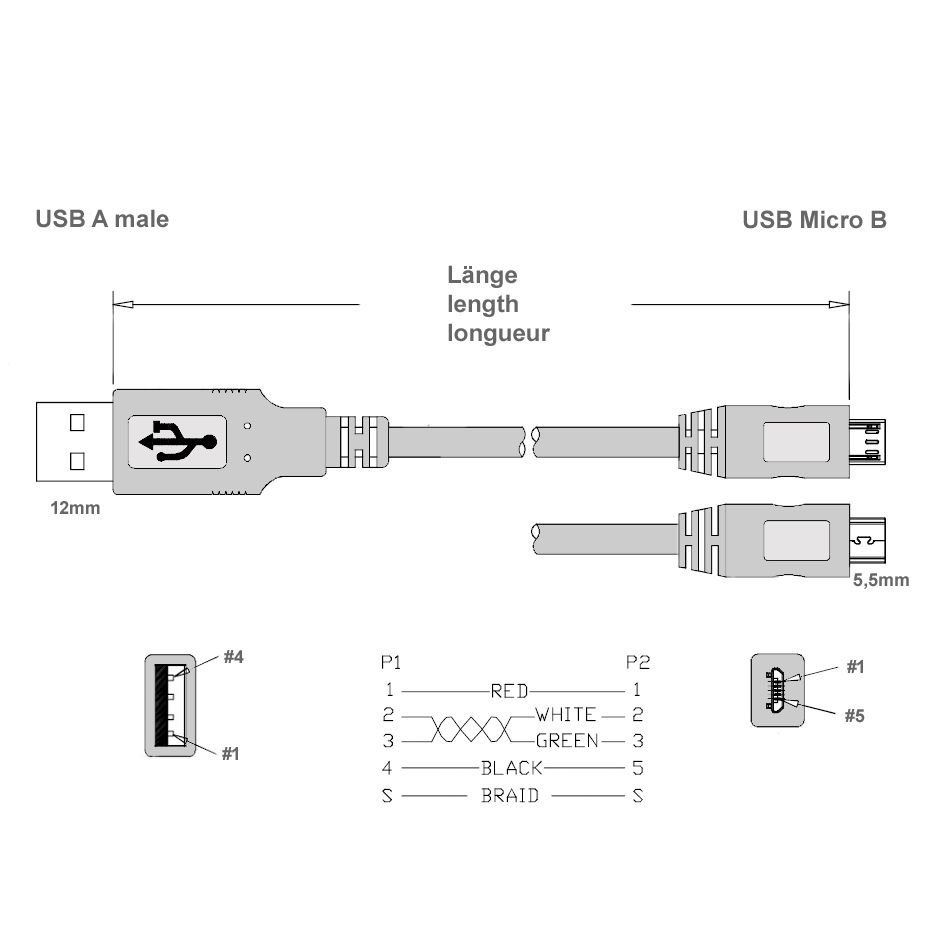 - Anschluss 2: USB 2.0 Micro B Stecker männlich 5-polig (4-polig belegt)