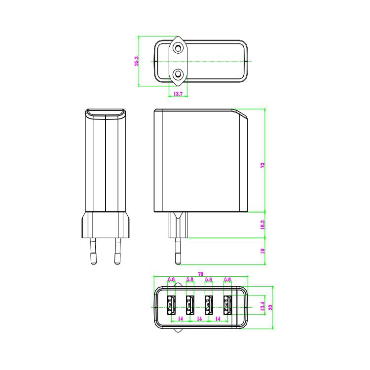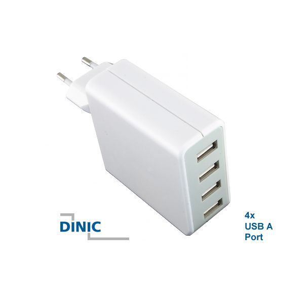 Dieses hochwertige Stecker-Netzteil mit 4 USB-Ports ist zum schnellen Aufladen Ihres Handys, Smartphones oder Tablets ideal. Durch die automatische Erkennung auf den einzelnen USB Ports, ist dieser universelle Ladeadapter auch mit z.B. Apple und Samsung Geräten bei gleichzeitigem Laden kompatibel.