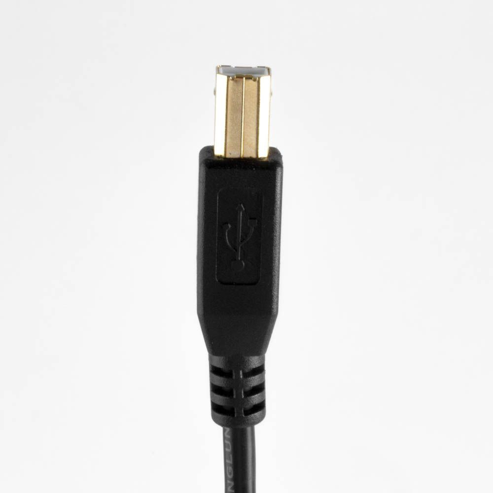 Die Zuverlässigkeit der Funktionsweise wird durch die vergoldeten Kontakte erhöht. Das High-End-Kabelmaterial ist doppelt abgeschirmt (flexible Aluminiumfolie + Geflecht-Umhüllung) und beide Stecker sind intern komplett metallgeschirmt. Die Zugentlastung ist bei beiden Steckern angegossen. Das Kabel ist USB 2.0 und USB 1.1 geeignet, also abwärtskompatibel, und unterstützt die maximale USB 2.0 Geschwindigkeit von 480 MBit/s (entspricht 60 MByte/s).