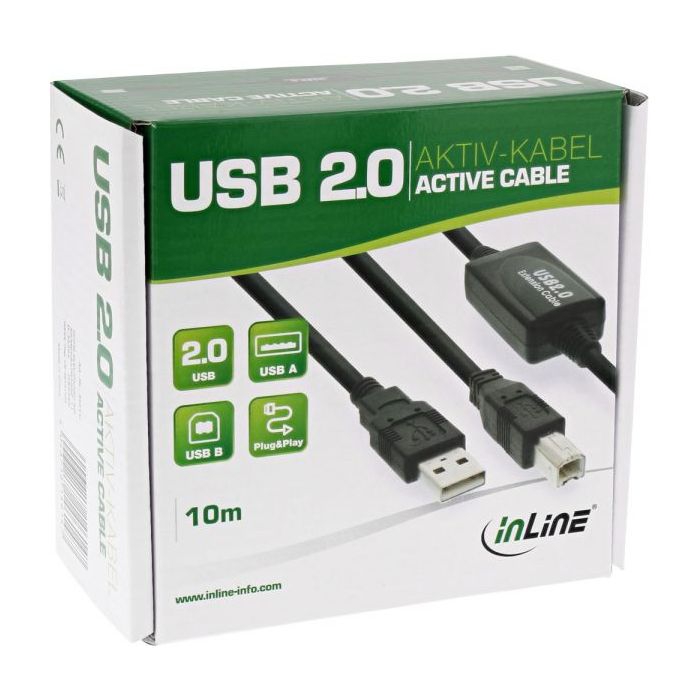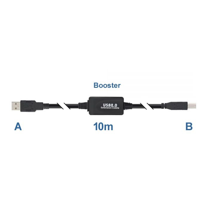 Extra langes USB-Kabel 10m, für USB 2.0 + USB 1.1, mit integriertem Verstärker (kleine Booster-Box in Kabelmitte), A-Stecker an B-Stecker, USB 2.0 High Speed (480 Mbps), schwarz