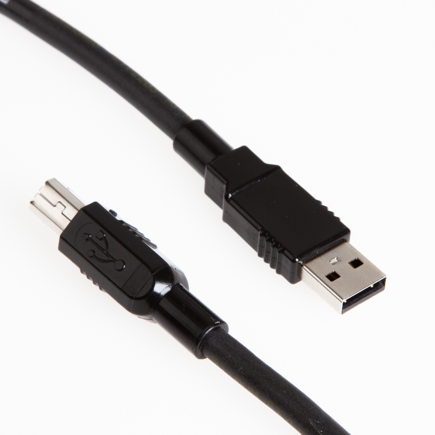 Das USB-Kabel vom Typ A/B wird fertig konfektioniert mit Steckern geliefert. Kundenspezifische Wünsche (wie z.B. Sonderlängen oder andere Stecker) können berücksichtigt werden, weil wir dieses High-End-Kabel in Deutschland herstellen und kleinere Stückzahlen üblich sind. Aufgrund der sehr dicken Kupferadern (AWG22) und der sehr guten Kupferschirmung (>90% Abdeckung) sind USB-Kabellängen bis 12m ohne Verstärkereinsatz möglich.
