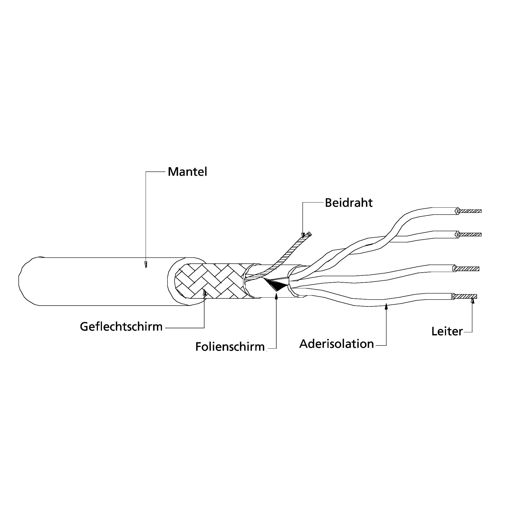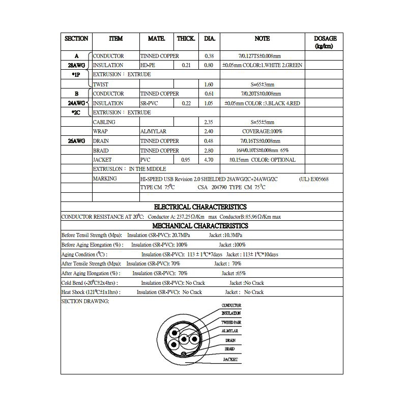 Mit den Adernstärken AWG28/1P und AWG24/2C, d.h. mit einem dickern Adernpaar für die 5V-Stromversorgung, entspricht das Material den Anforderungen der USB-Norm und ist für die Konfektionierung max. 5m langer USB-Kabel geeignet. Die Datenleitungen (AWG28/1P) sind paarig verdrillt.