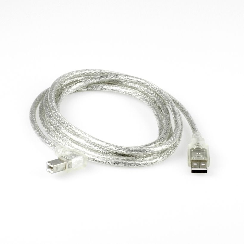 USB 2.0 Kabel mit abgewinkeltem B-Stecker (nach links), 2m, Premium-Qualität: 28AWG/1P 24AWG/2C, doppelt geschirmt, Farbe: Silber-transparent, Marke DINIC