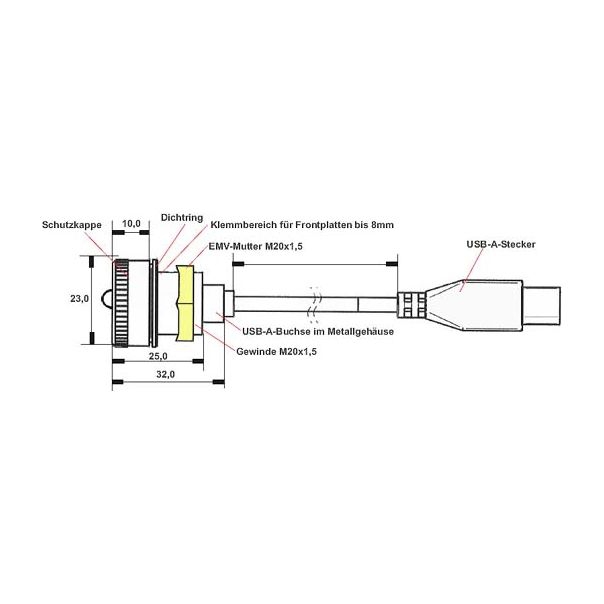 - Buchse USB. 2.0 Typ A (anschraubbar mit schraubbarer Kappe)