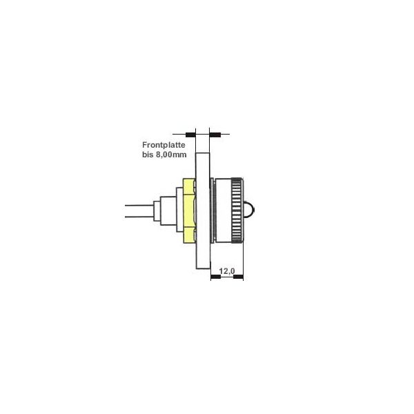 Für die Befestigung des IP-Montagekabels ist die abgebildete Frontplattenaussparung erforderlich. Durch die untere Abflachung wird ein Verdrehen der Buchse verhindert. Der Metallkörper des USB-Montagekabels wird rückseitig mit einer großen Mutter (gelb dargestellt) befestigt. Diese EMV-Mutter ist mit Metallspitzen ausgestattet, so dass auch bei lackierten oder eloxierten Gehäusen eine Metall-Metall-Verbindung herstellt wird.