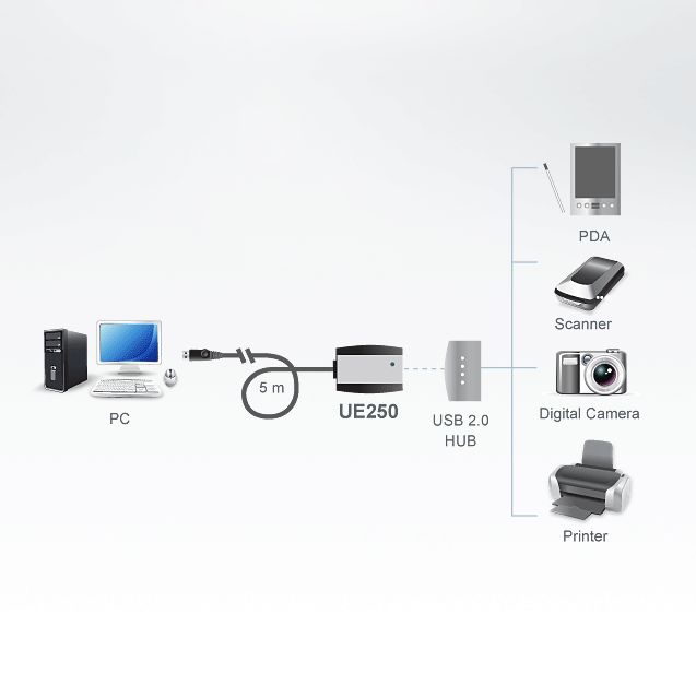Die Kabellänge von Gerät zu Gerät darf bei USB maximal 5m betragen. Wird diese Länge überschritten, muss ein Signalverstärker (Repeater) eingesetzt werden. Die ATEN-Aktiv-Verlängerung besitzt einen solchen Signalverstärker.