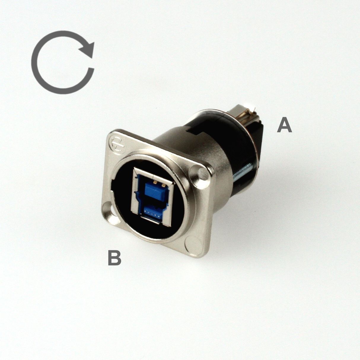 USB 3.0 Montageadapter, USB 3.0 A Buchse (außen) auf USB 3.0 B Buchse (innen), Adapterkern drehbar (A oder B vorne), Metallausführung, Hersteller NEUTRIK, silberfarben (alte Art.-Nr. CU-ADAP-09)