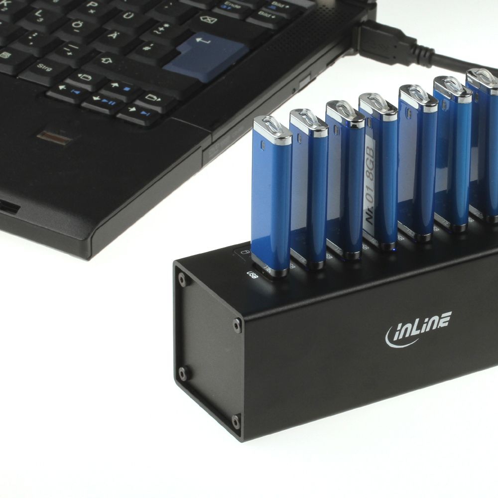 Der HUB ist z.B. ideal, um 10 USB-Sticks gleichzeitig zu beschreiben. Die 10 Ports liegen so weit auseinander (8mm), dass die meisten Sticks genügend Platz haben und sich nicht gegenseitig behindern. Bei vielen anderen HUBs gibt's Einsteckprobleme.