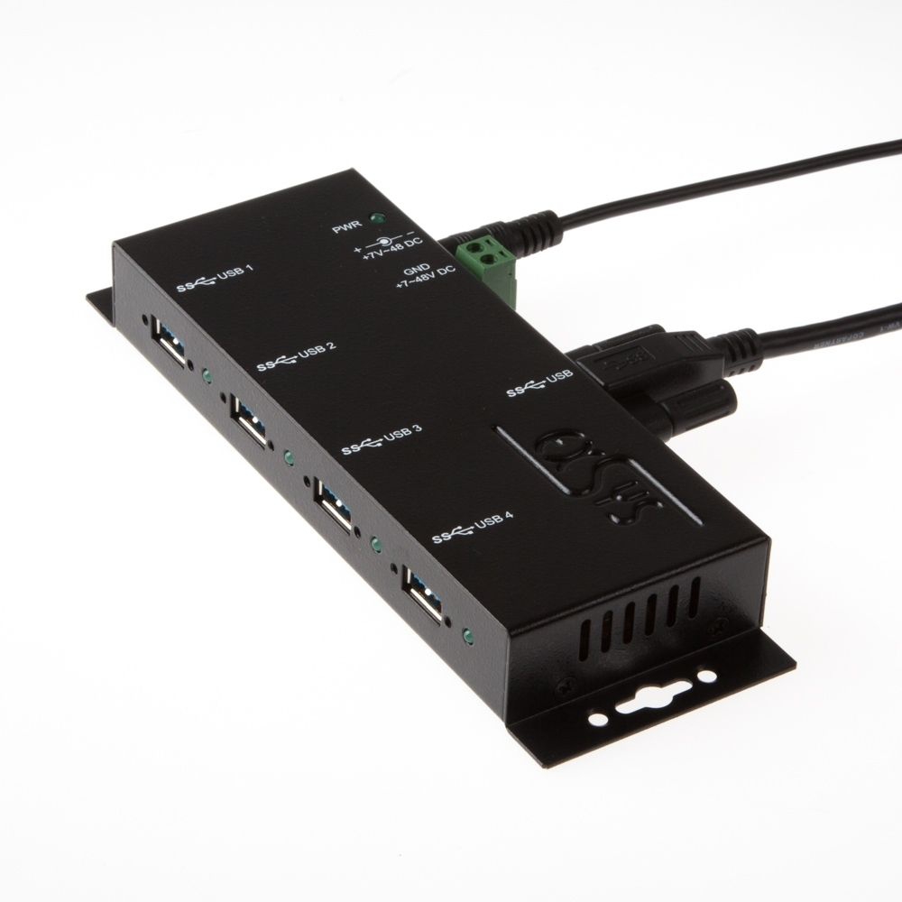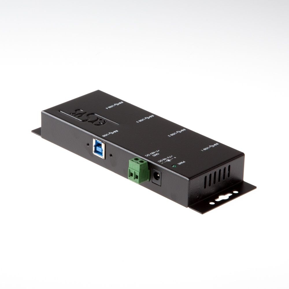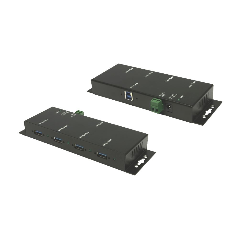 Der robuste und industrietaugliche EX-1184HMVS-2 ist ein USB 3.2 Gen 1 Metall Hub für bis zu vier Endgeräte. Der Hub stellt vier verschraubbare USB 3.2 Gen 1 Downstream-Ports mit 15KV ESD Überspannungs-Schutz zur Verfügung. Es ist möglich bis zu vier externe USB Peripheriegeräte an einen USB 3.2 Gen 1 Port vom Notebook, Desktop Rechner oder Server im 19" Rack anzuschliessen. Es wird die SuperSpeed USB 3.2 Gen 1 Datenübertragungsrate von bis zu 5Gbit/s unterstützt und ist abwärtskompatibel bis USB 1.1. Das mitgelieferte USB 3.2 Gen 1 Kabel kann ohne Schraubenzieher an der EX-1184HMVS-2 mit Rändelschrauben befestigt werden. Der EX-1184HMVS-2 kann über eine DC-Buchse, sowie über einen zwei drahtigen Klemmleisten Anschluss (+5V bis +24V) mit Strom versorgt werden. Der HUB erfüllt die speziellen Anforderungen von Industrieanwendungen.