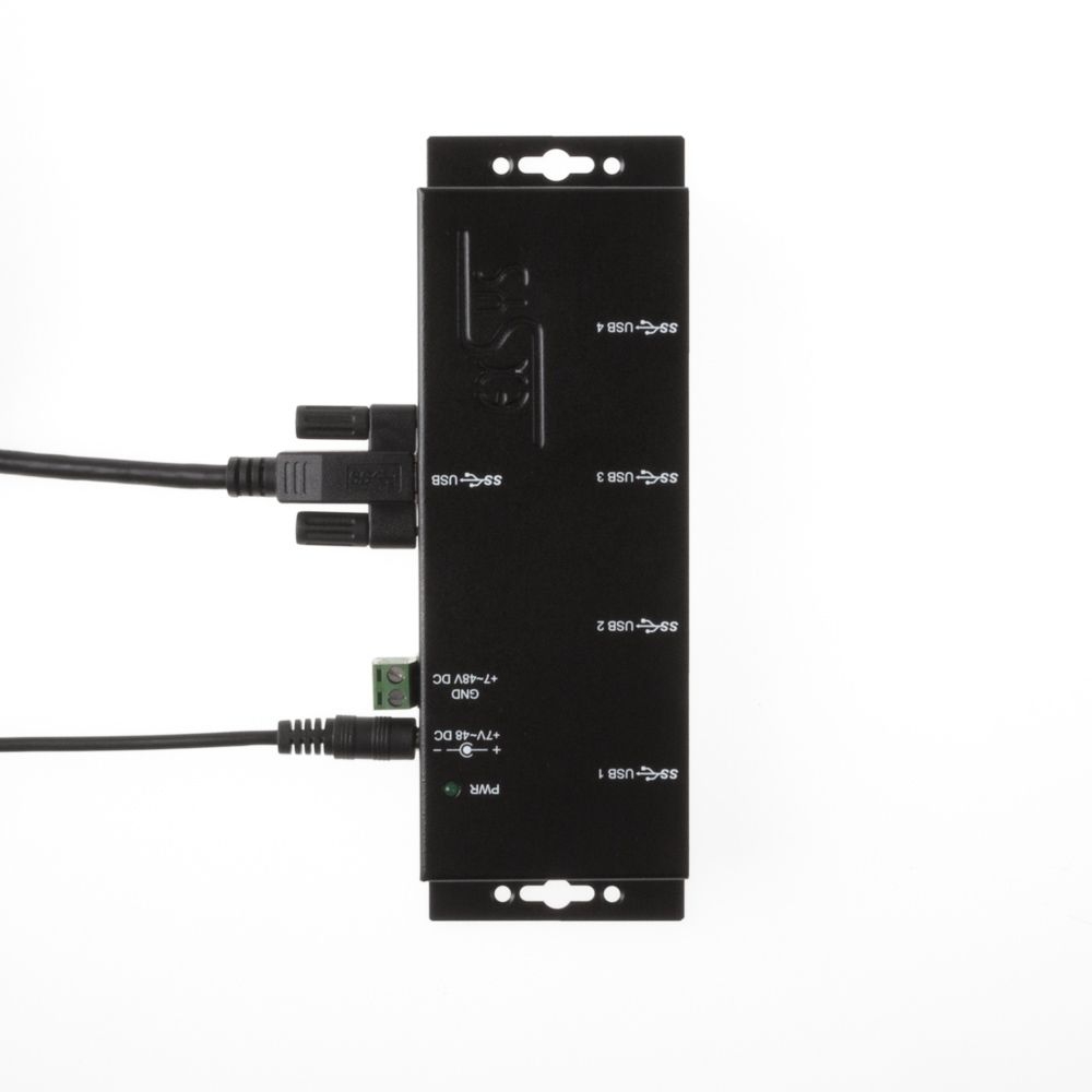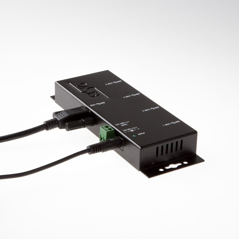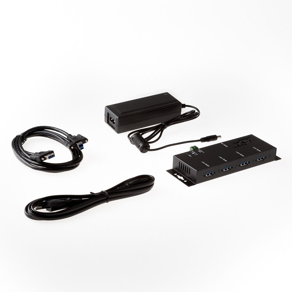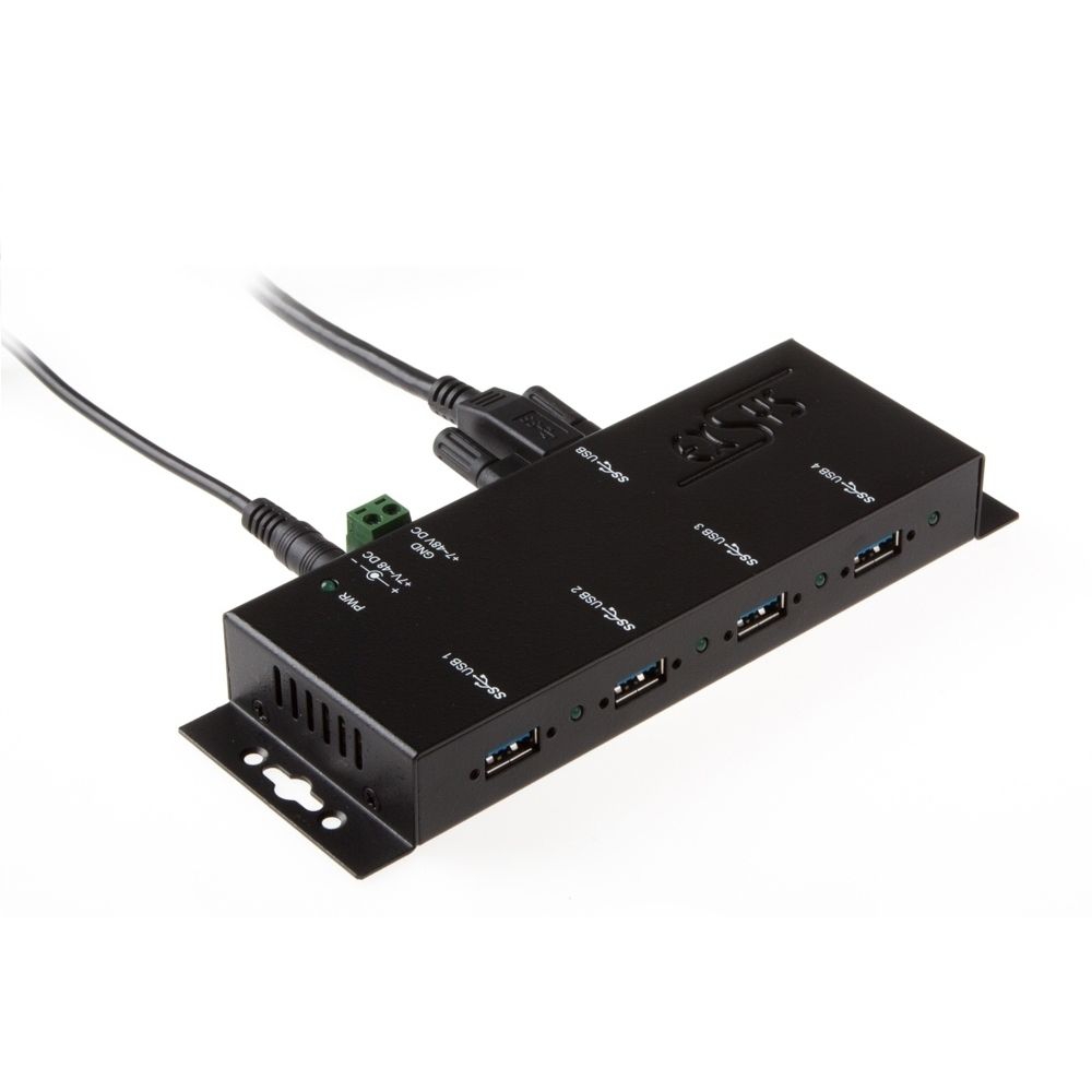 Der robuste und industrietaugliche EX-1184HMVS-2 ist ein USB 3.2 Gen 1 Metall Hub für bis zu vier Endgeräte. Der Hub stellt vier verschraubbare USB 3.2 Gen 1 Downstream-Ports mit 15KV ESD Überspannungs-Schutz zur Verfügung. Es ist möglich bis zu vier externe USB Peripheriegeräte an einen USB 3.2 Gen 1 Port vom Notebook, Desktop Rechner oder Server im 19" Rack anzuschliessen. Es wird die SuperSpeed USB 3.2 Gen 1 Datenübertragungsrate von bis zu 5Gbit/s unterstützt und ist abwärtskompatibel bis USB 1.1. Das mitgelieferte USB 3.2 Gen 1 Kabel kann ohne Schraubenzieher an der EX-1184HMVS-2 mit Rändelschrauben befestigt werden. Der EX-1184HMVS-2 kann über eine DC-Buchse, sowie über einen zwei drahtigen Klemmleisten Anschluss (+5V bis +24V) mit Strom versorgt werden. Der HUB erfüllt die speziellen Anforderungen von Industrieanwendungen.