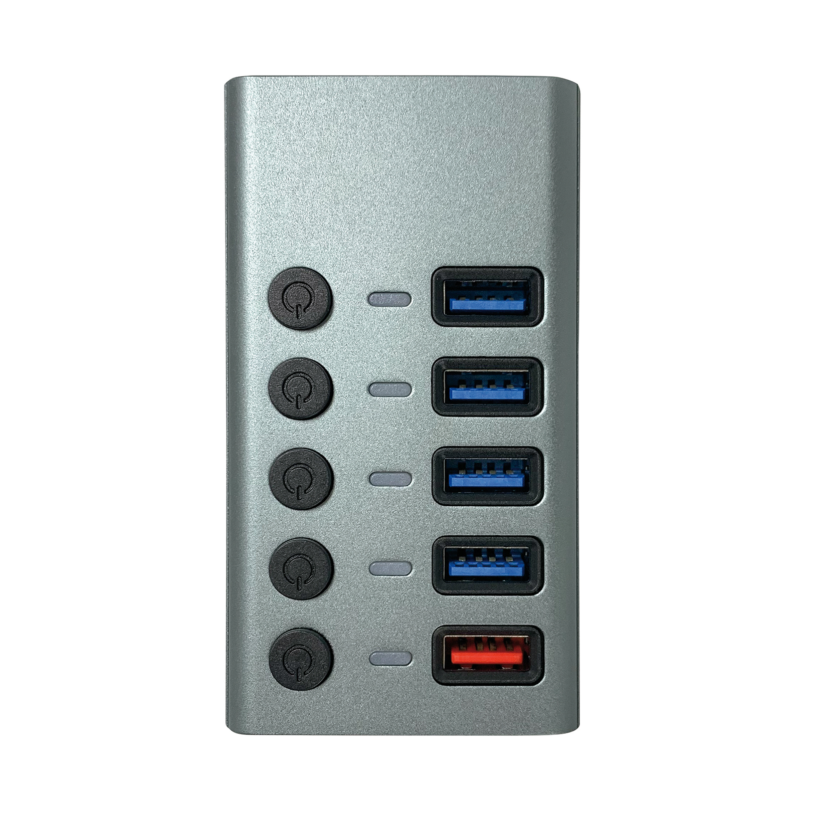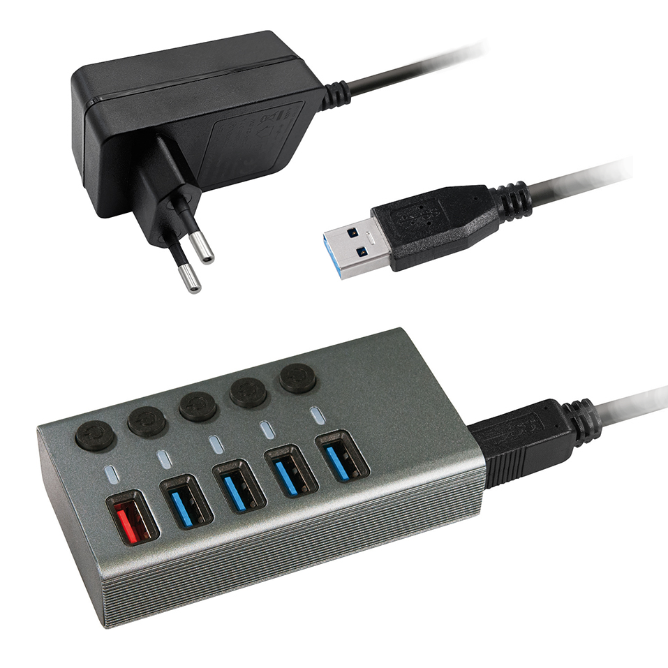5 Port USB 3.0 HUB im Metall-Gehäuse, 4x USB-Buchse + 1x Ladebuchse, Ports einzeln zuschaltbar, inkl. 1m USB-Kabel und 2A Netzteil