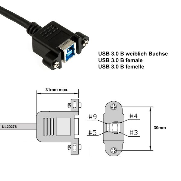 - Buchse USB 3.0 Typ B (anschraubbar) an Stecker USB 3.0 Typ B