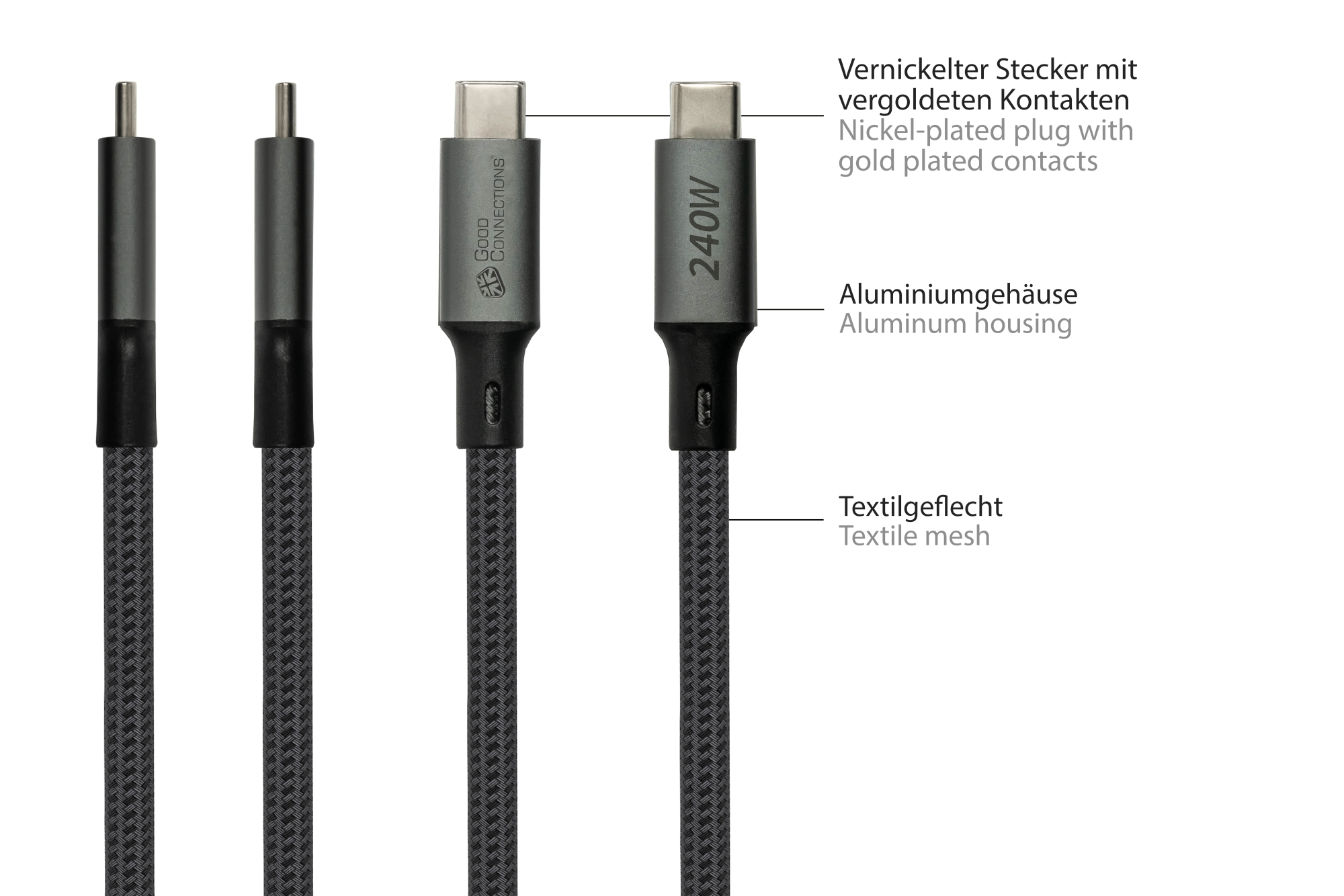 Das Good Connections® USB 4.0-Kabel ist mit seinem eleganten und robusten Textilgeflecht und seinen stabilen Vollmetallanschlüssen ein stets zuverlässiger Begleiter und ein echter Blickfang. Das herausragend verarbeitete Kabel ist flexibel und stabil zugleich. Ausgewählte, hochwertige Materialien sorgen für eine lange Nutzungsdauer, selbst bei täglichem Gebrauch.