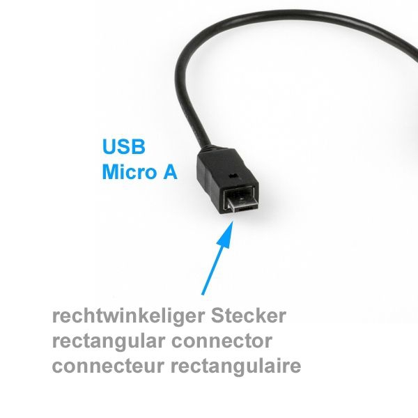 Bitte beachten Sie, dass der USB Micro A Stecker eine rechtwinkelige Form hat, ohne abgeschrägte Seiten. Die entsprechende Micro A Buchse, in die das Kabel eingesteckt werden soll, muss daher ebenfalls rechtwinkelig sein.