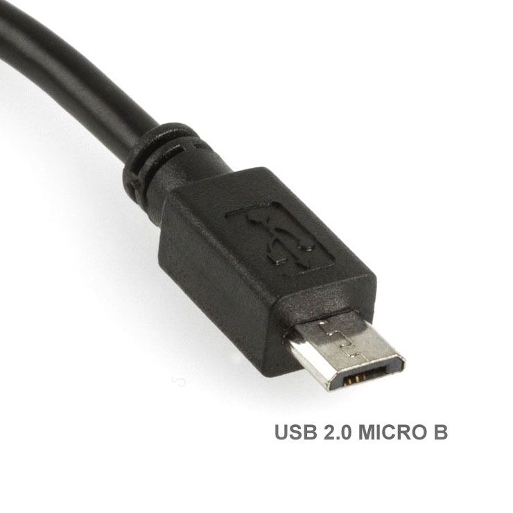 Spezielles Adapterkabel, welches mit dem sehr kleinen Micro-USB-Stecker (Typ B) ausgestattet ist. Auf der anderen Kabelseite befindet sich eine Buchse für USB A.