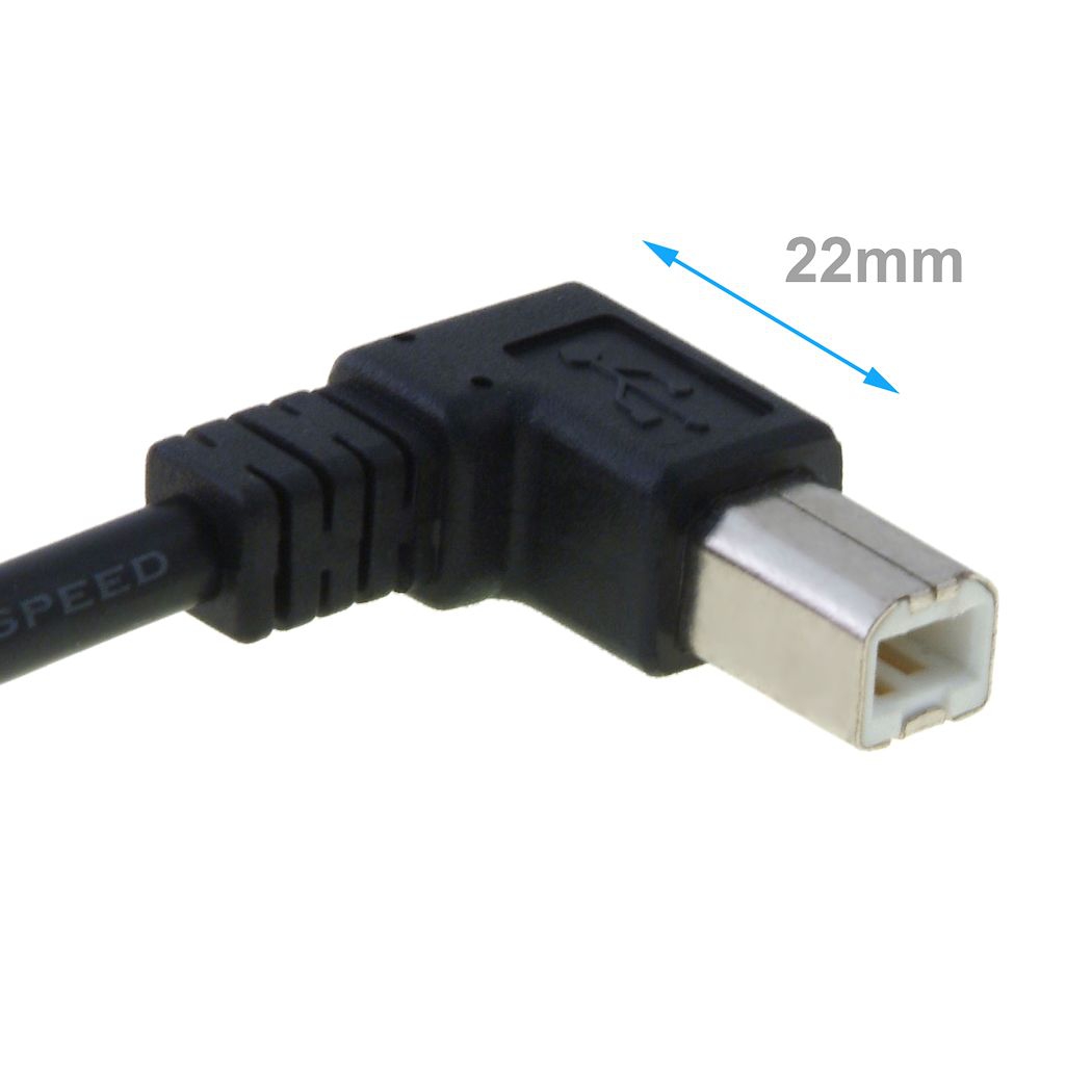 Das hier angebotene USB-Kabel hat einen um 90° abgewinkelten USB-Stecker Typ B. Dadurch eignet sich das Kabel besonders für den platzsparenden Anschluss von USB-Geräten. Der Stecker-Überstand ist nur ca. 22mm (siehe Bild).