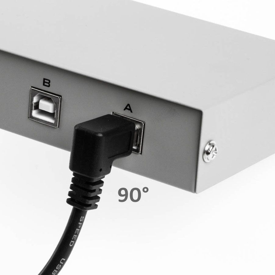 Das hier angebotene USB 2.0 Kabel hat einen um 90° abgewinkelten USB-Stecker Typ B. Dadurch eignet sich das Kabel besonders für den platzsparenden Anschluss von USB-Geräten.