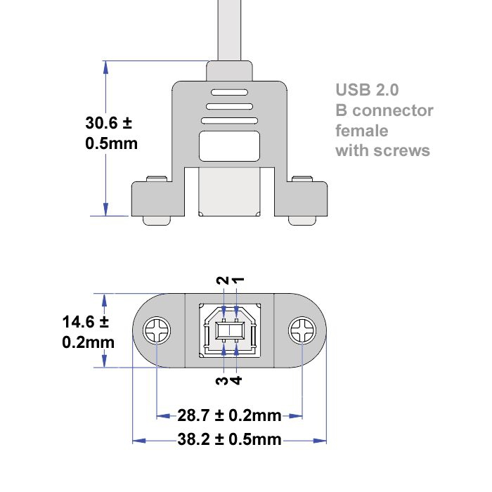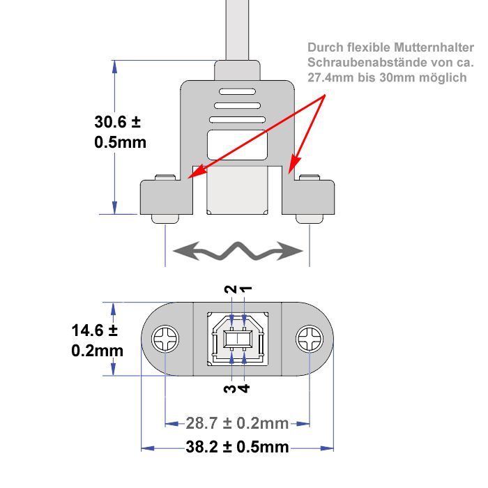 Der Schraubenabstand beträgt 28.7mm. Dadurch, dass die zwei Mutternhalter der USB-B-Buchse etwas flexibel sind, lassen sich auch Schaubenabstände von etwa plus/minus 1.3mm realisieren. Der Schraubenabstand kann somit ca. 27.4mm bis 30mm betragen. Daher kann das hier angebotene Montagekabel CU-MB-05-VAR als Alternative zu unserem Kabel CU-MB-05 (mit 30mm Schraubenabstand) eingesetzt werden, falls dieses nicht am Lager ist.
