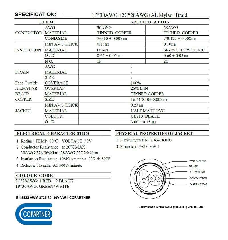 - Adernstärken: 28AWG/2C und 30AWG/1P Kupfer