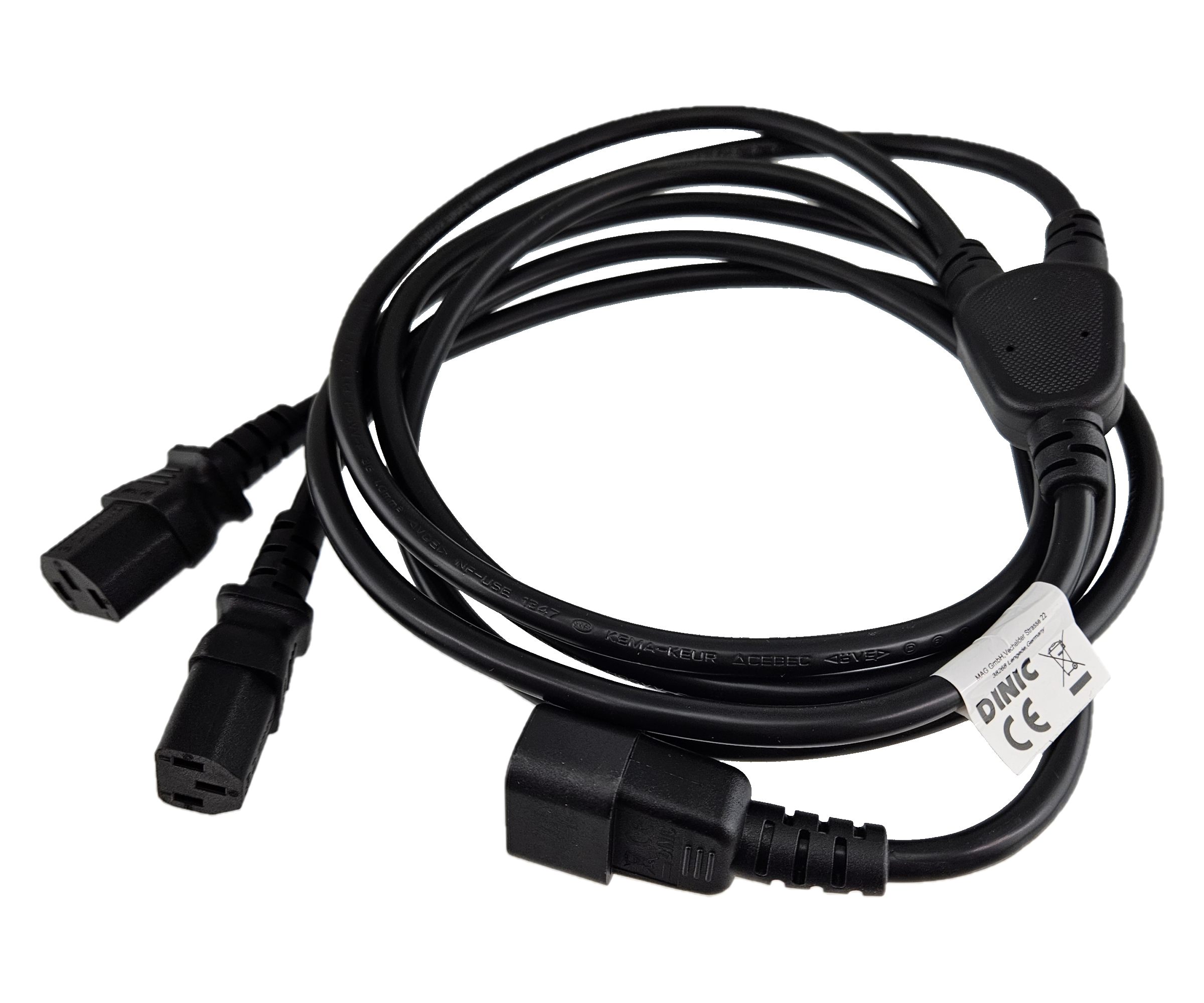 Y-Kaltgerätekabel, 1x Kaltgerätestecker C14 an 2x Kaltgerätebuchse C13 (Y-Verzweigung), Länge 2m (C14 bis Y 120cm, Y bis 2x C13 je 80cm)